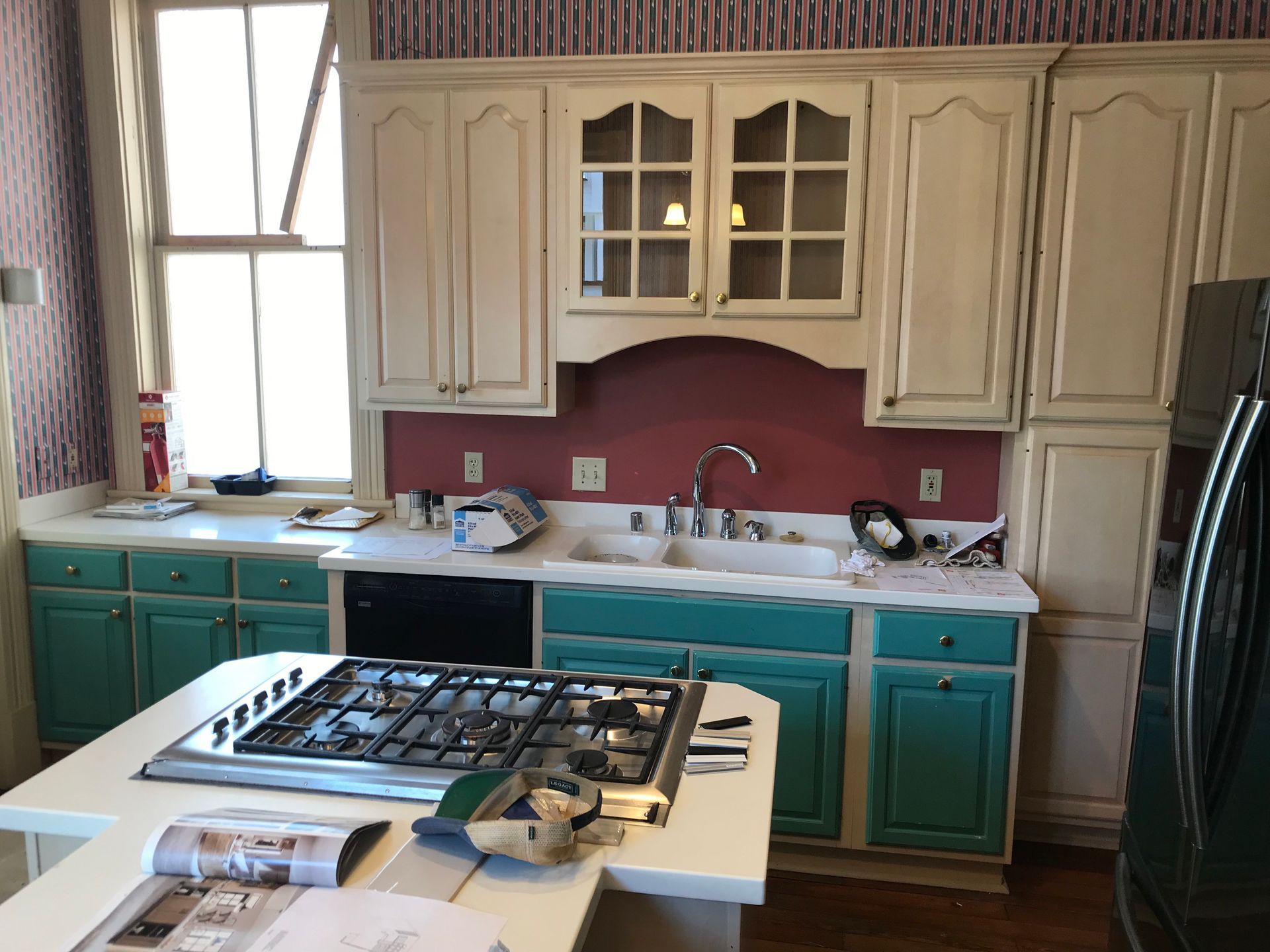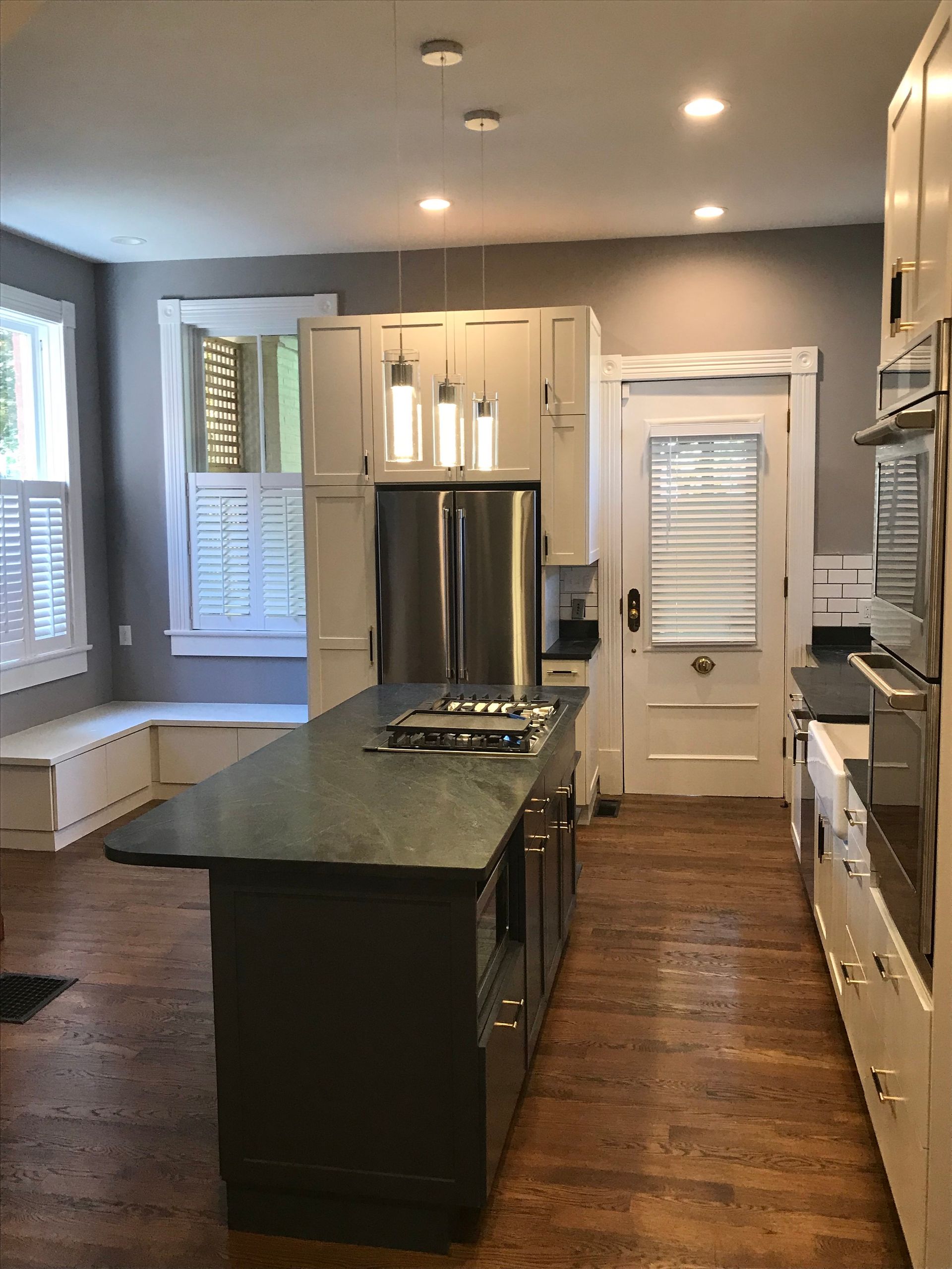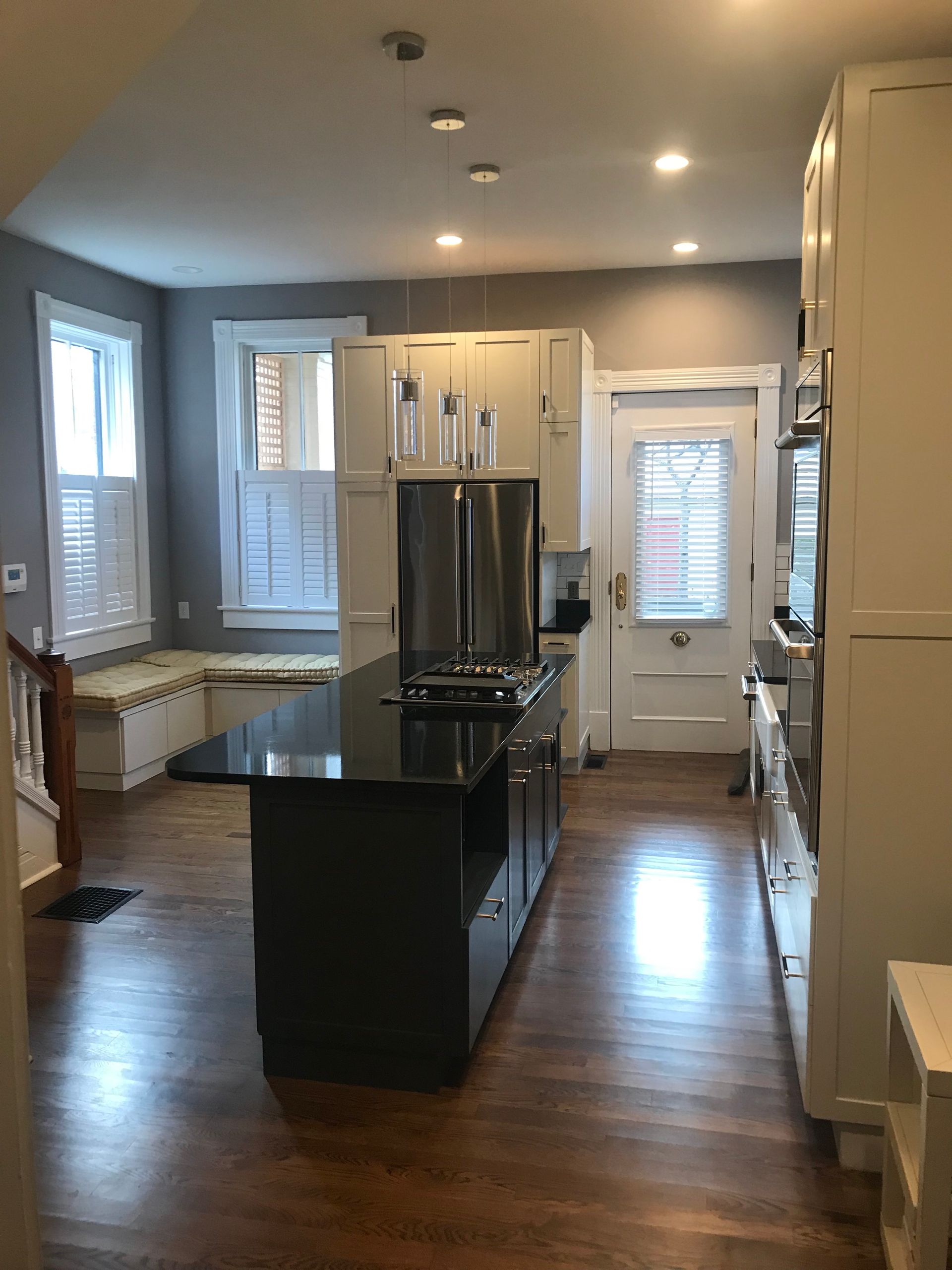 The renovation began with brand-new cabinetry, offering both improved storage and a clean, elevated aesthetic. A suite of stainless steel appliances was added to enhance performance and bring a polished, contemporary feel to the room. The true focal point of the remodel is the custom-made island built specifically for this kitchen, featuring a gas stovetop and a striking black countertop that grounds the space with sophistication and contrast.